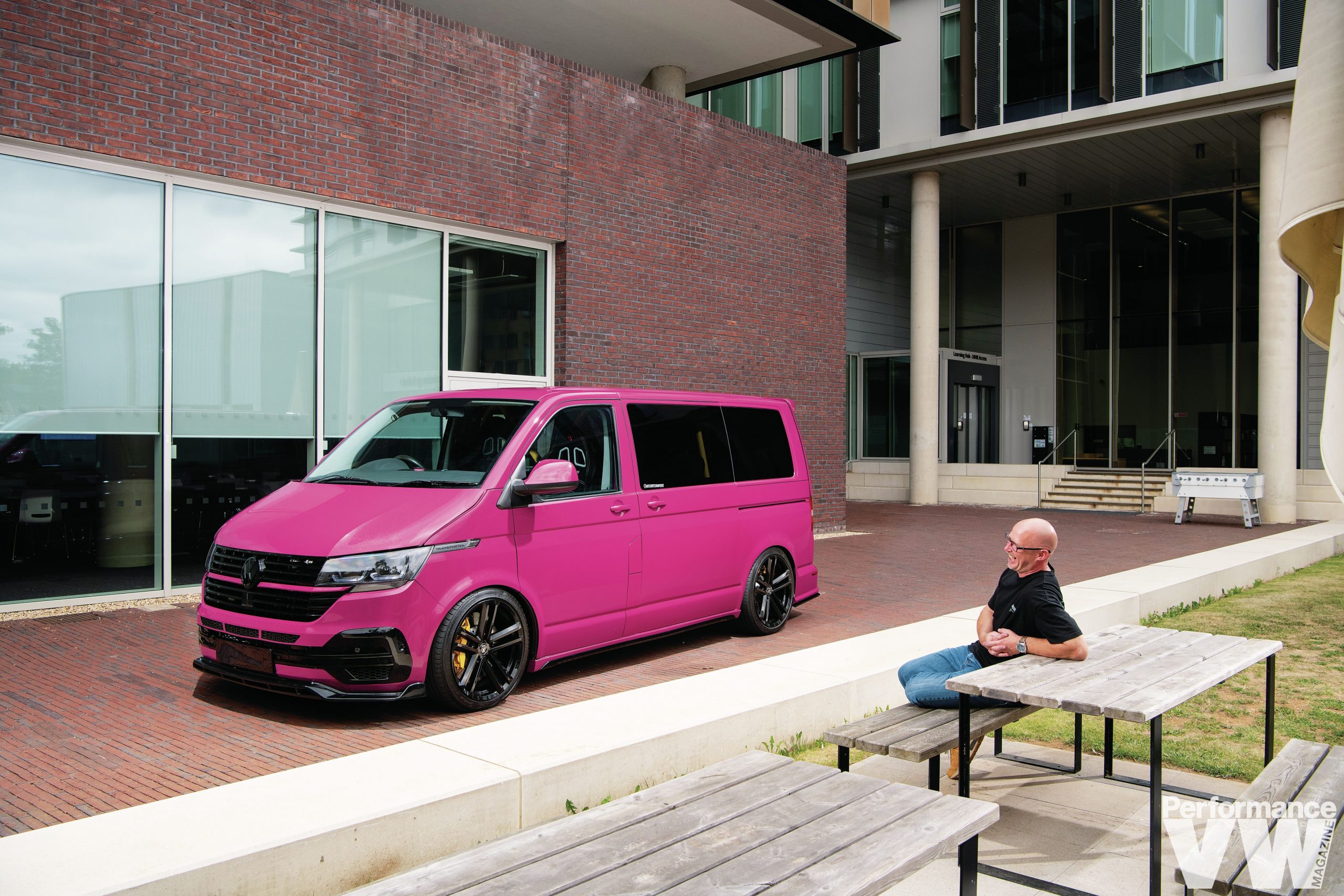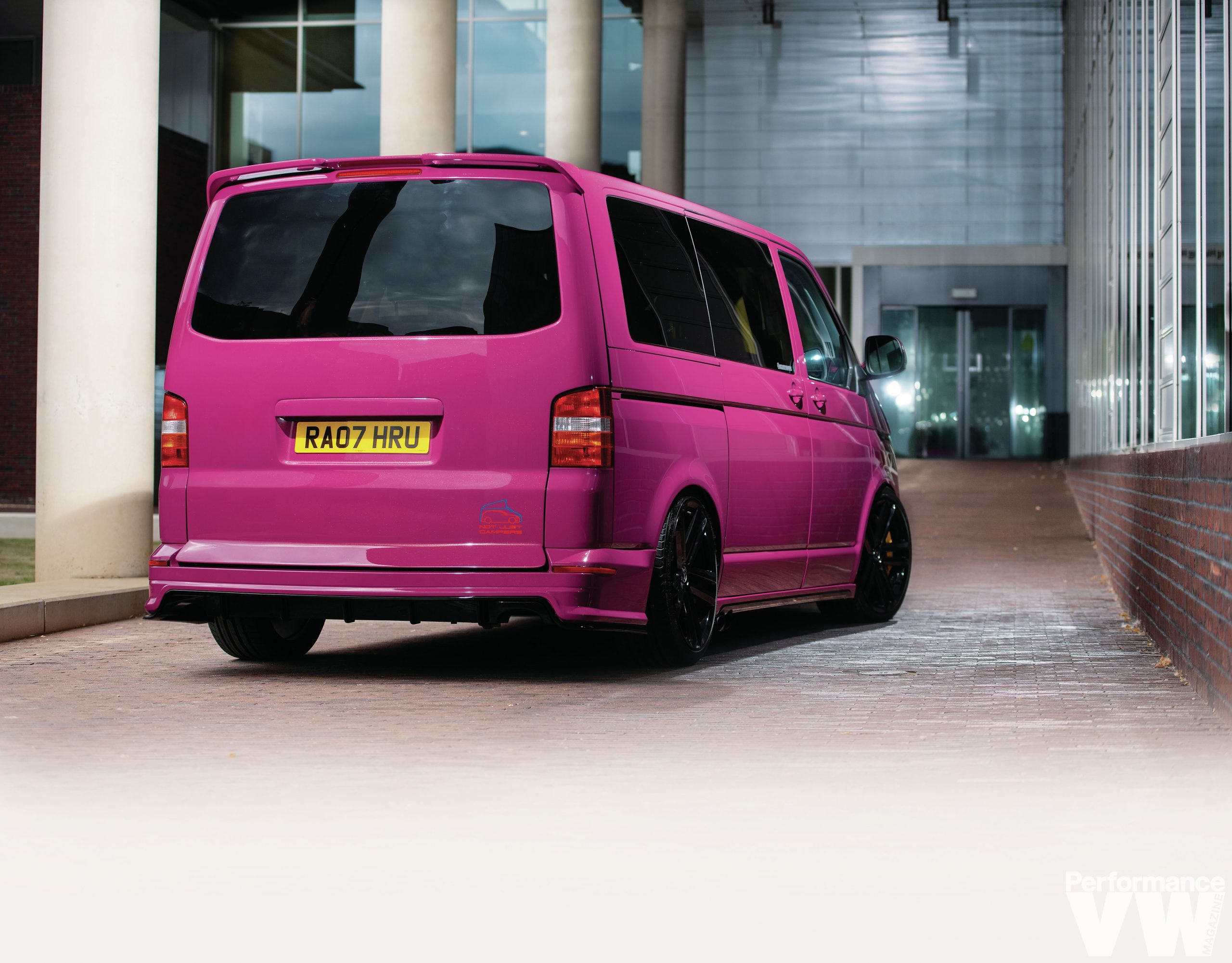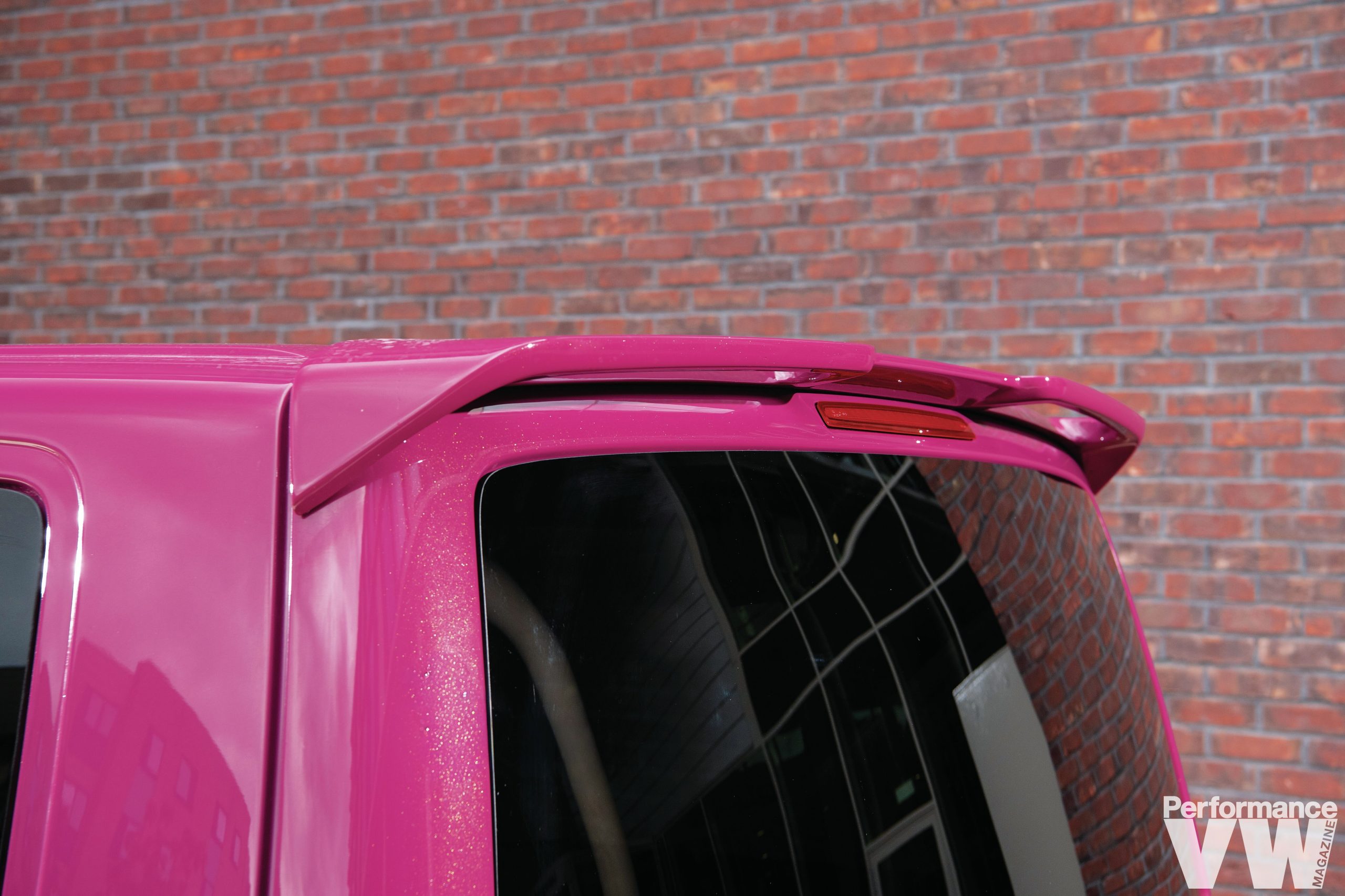 Full respray in Porsche Rubystar (Rubystone) Red. Full T6.1 Transporter front end conversion with Sportline front bumper; wings and bonnet, Travelinlite front splitter; Transporter HQ T6.1 DRL headlight upgrade; Fiesta ST rear spoiler, Sportline side skirts |