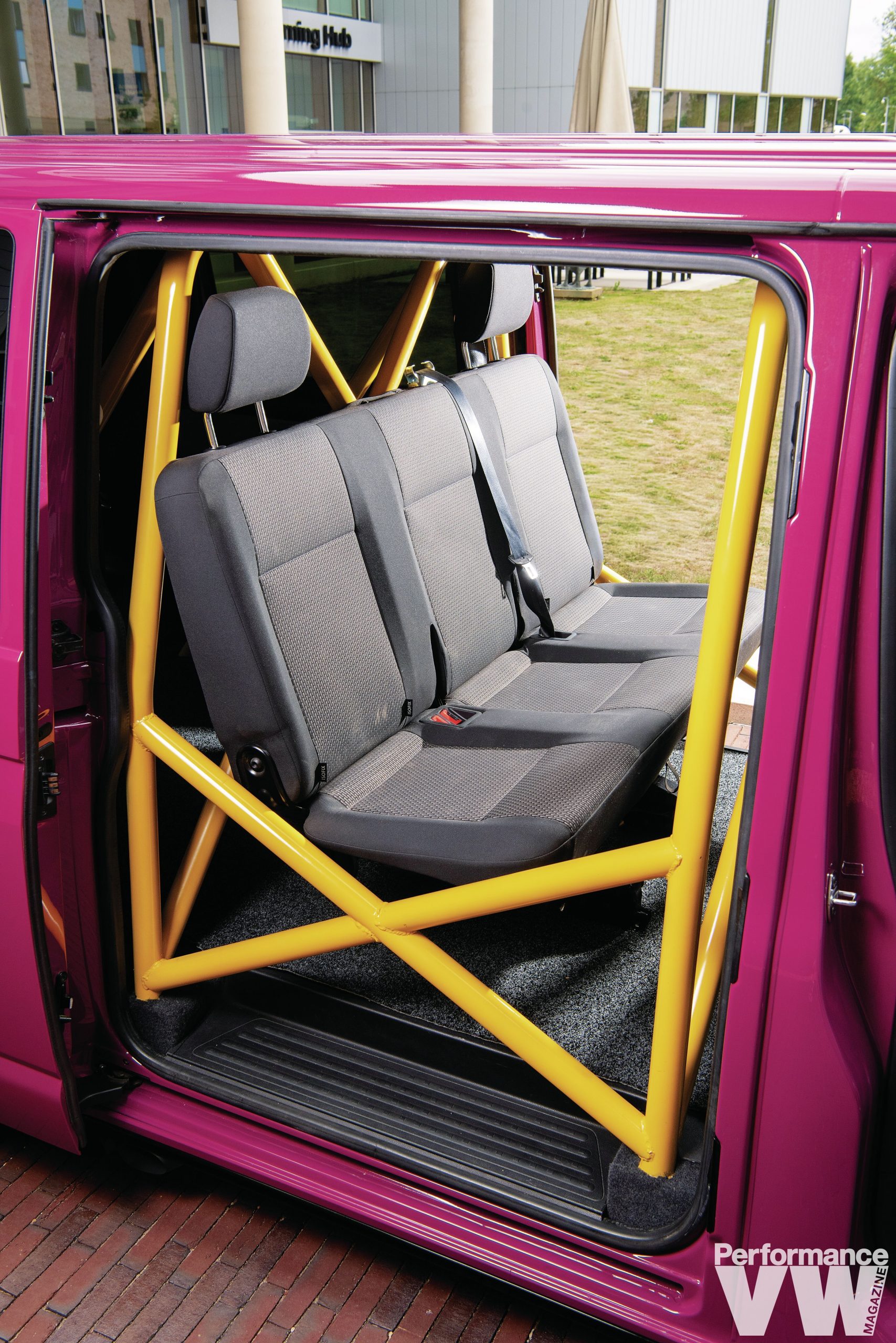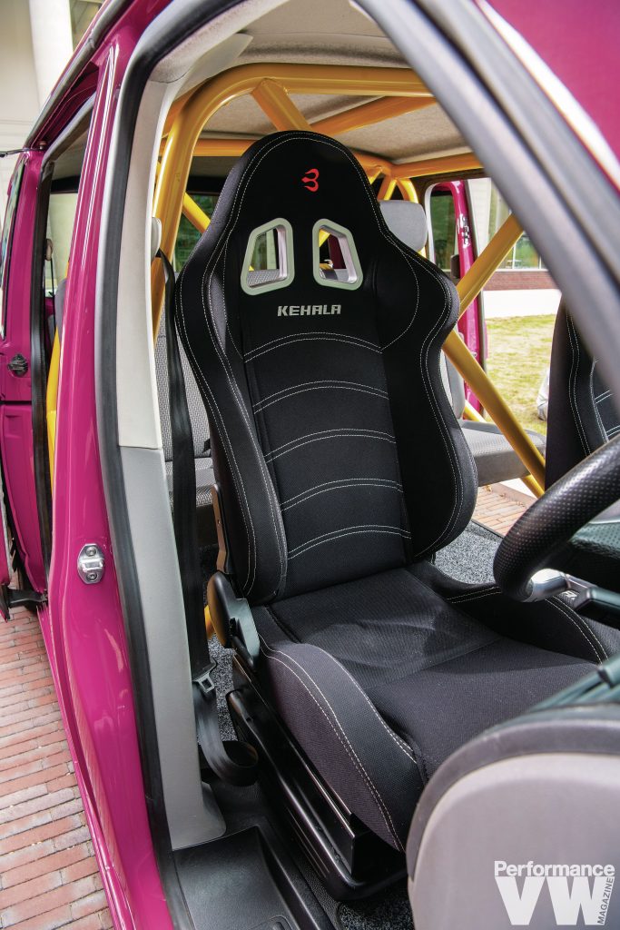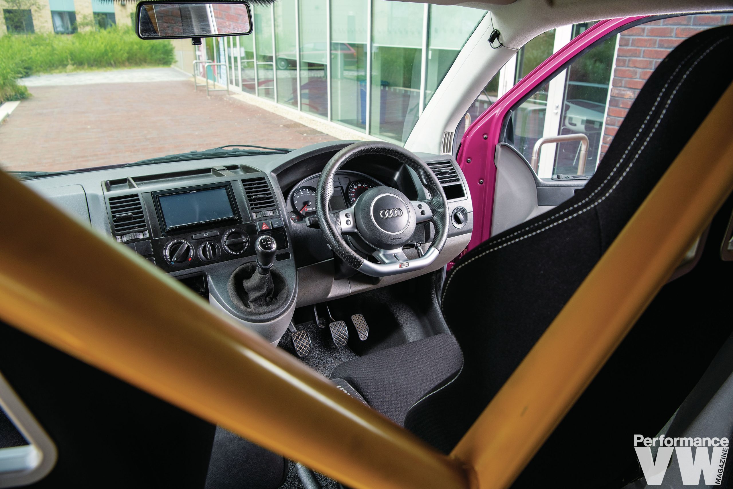 Kehala sports seats: fully functional RS4 steering wheel; RS4 clocks: Custom gear linkage and shift cables to retain T5 gear stick location; stock T5 door cards and carpets; OEM+ interior treatment, full custom CDS roll cage in rattle can yellow |