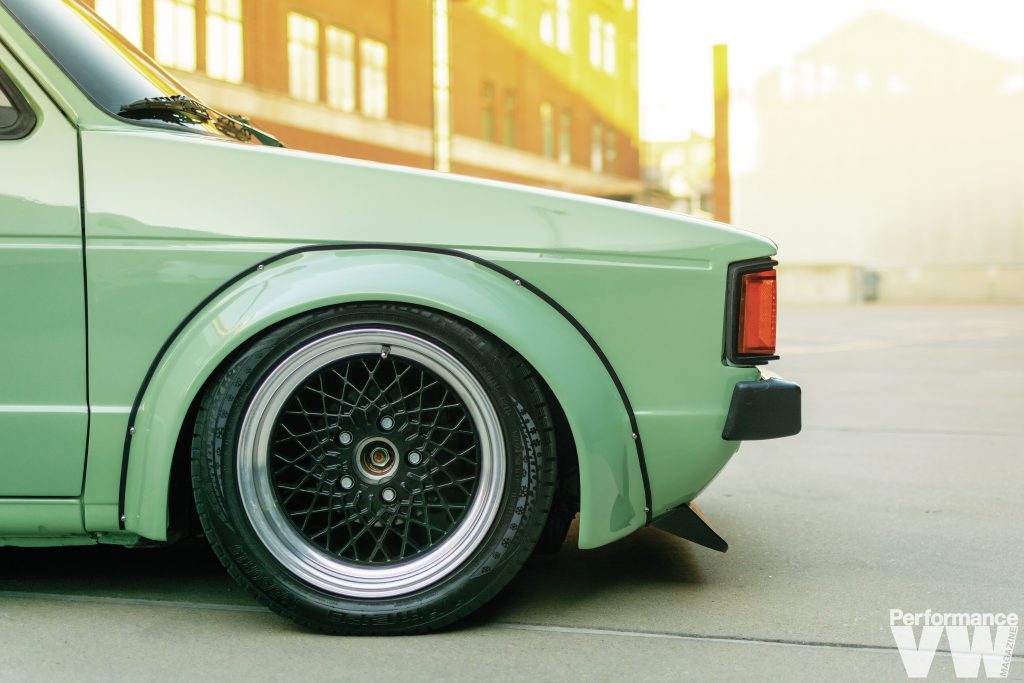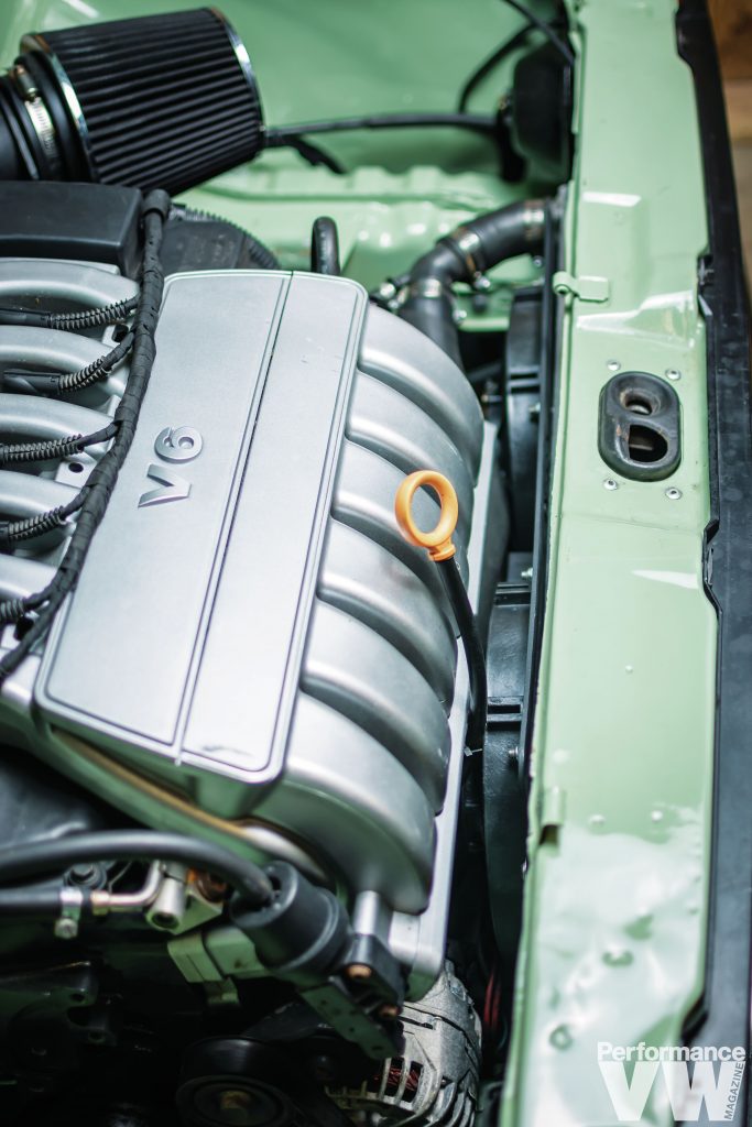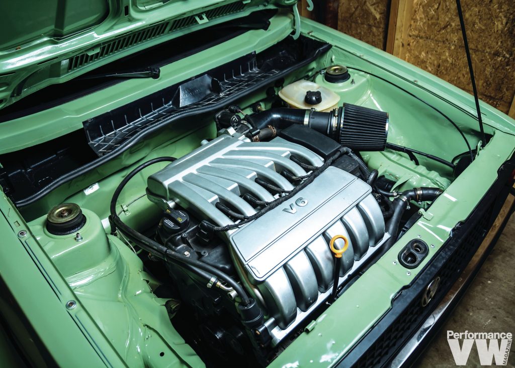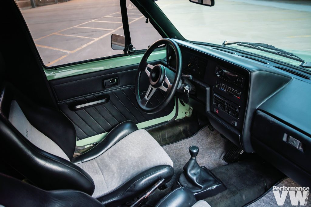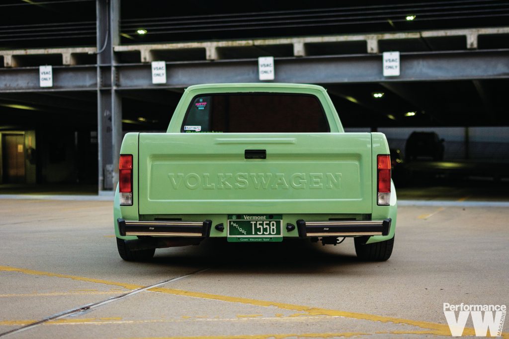 The stock diesel was evicted to make way for a 2.8L VR6 swap. “One thing most people don’t know about me is I would rather build cars than drive them,” confesses Erik. “The feeling it gives me building them is amazing.” He once again employed his talents to respray the truck in a factory shade of Mountain Green – think Arizona Green Tea without the cherry blossoms. Before that was done, he tirelessly removed and dents, dings, and imperfections, as well as any rust.