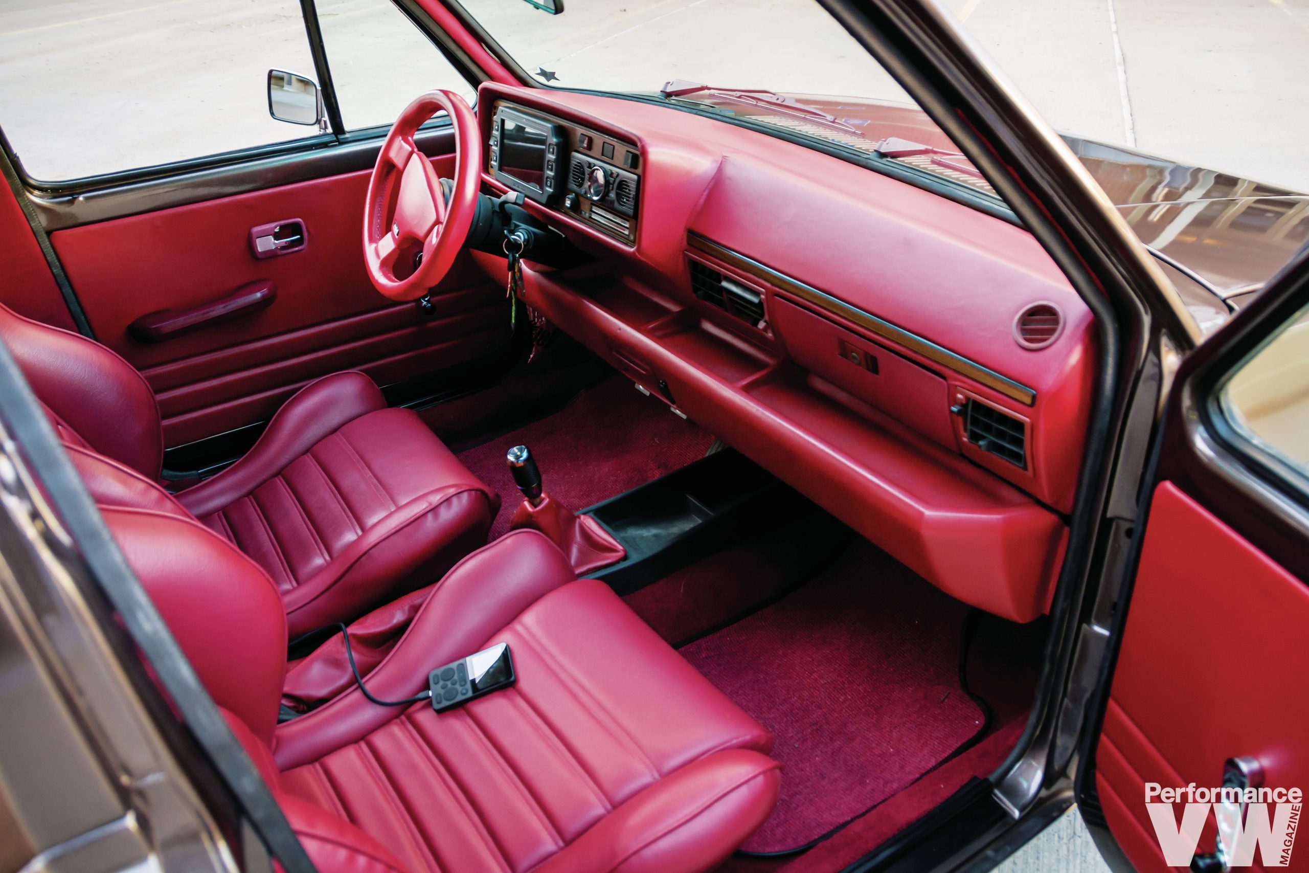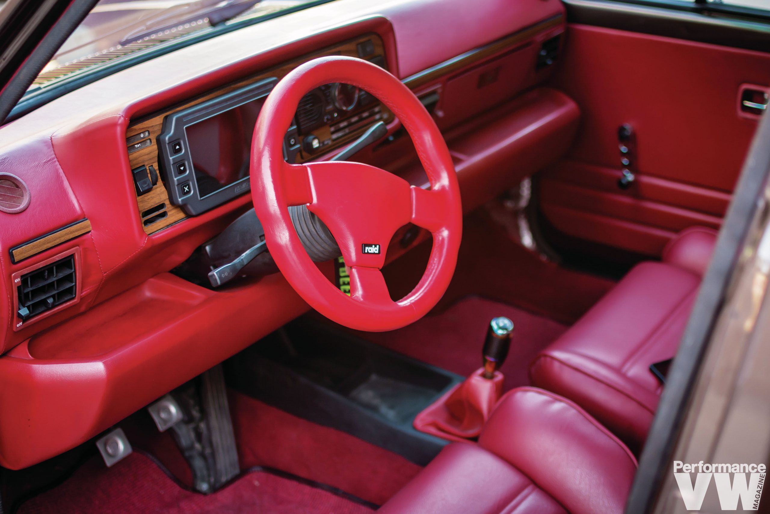 Early Westy dash retrimmed in red leather, recovered door panels in red leather, Recaro Trophy seats, Scrape Empire custom shift boot and floor mats, Raid steering wheel 5752_34272d-60> |