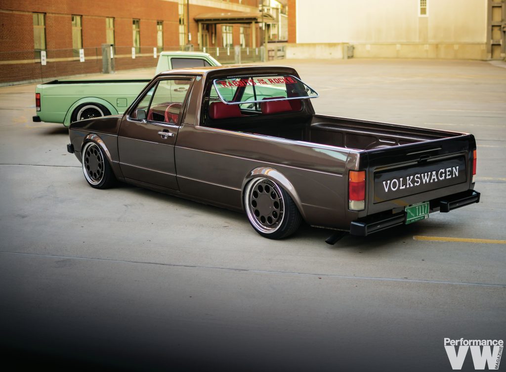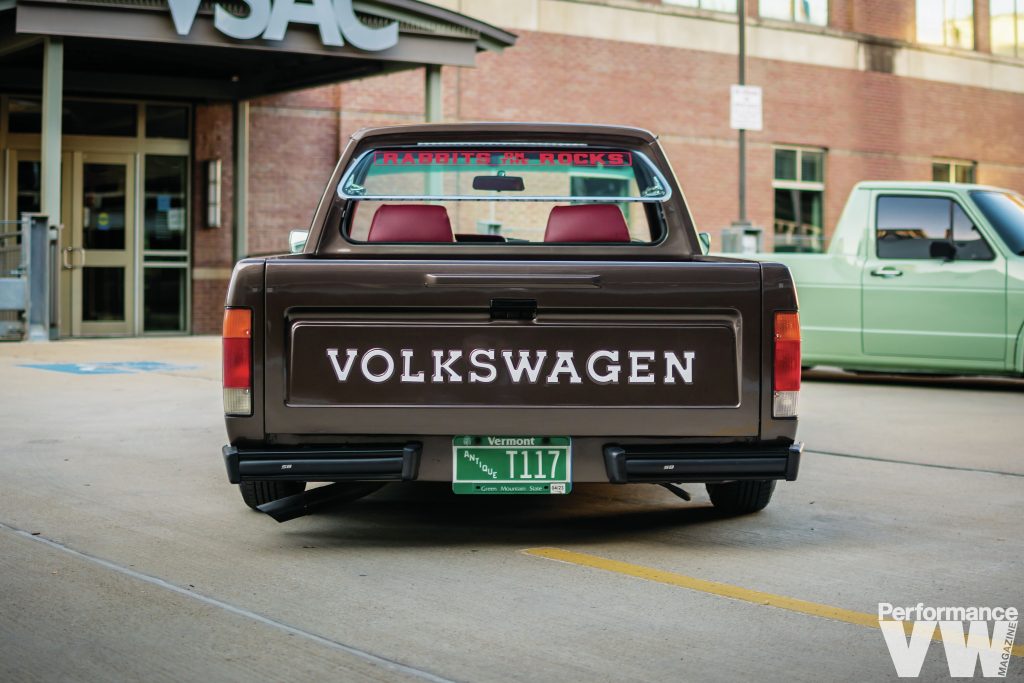 “Shortly after picking it up, I had a carbureted motor in it and drove it for a couple weeks and decided I wanted to put a 2.5 07K in it. With my previous truck, I had bought a swap kit, but the problem with VR6 and 07K swap kits is you need to run custom size axles which I’m not a fan of.” His solution was to cut the frame rail and custom make the mounts so he could run stock axles. After completing the swap, some ECU problems plagued it momentarily, but once they were sorted it ran great. The motor itself, originally from a 2015 Rabbit, has an Integrated Engineering intake manifold and valve cover. S&P Automotive was tapped for the radiator and oil relocation kit. Erik paints every motor and transmission and you’ll notice, in this instance, it’s a complementing red. Once again, his buddy Dave from TDC Shop cooked up the wiring harness. It all sits nicely in a bay that isn’t exactly shaved, but is still missing a few things that the keen observer would notice. He drove it as-is for over two months before deciding to tear the whole truck down. In the interim, his green truck took Best in Class for Rabbit Pickups at Roots Classic in Wildwood, NJ.