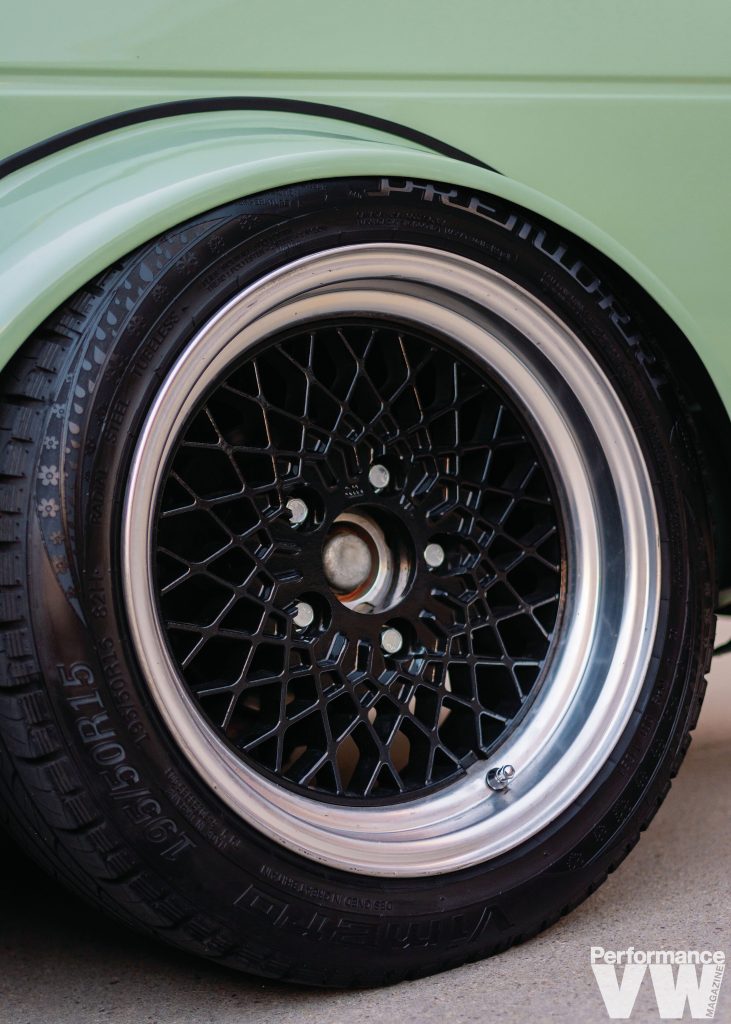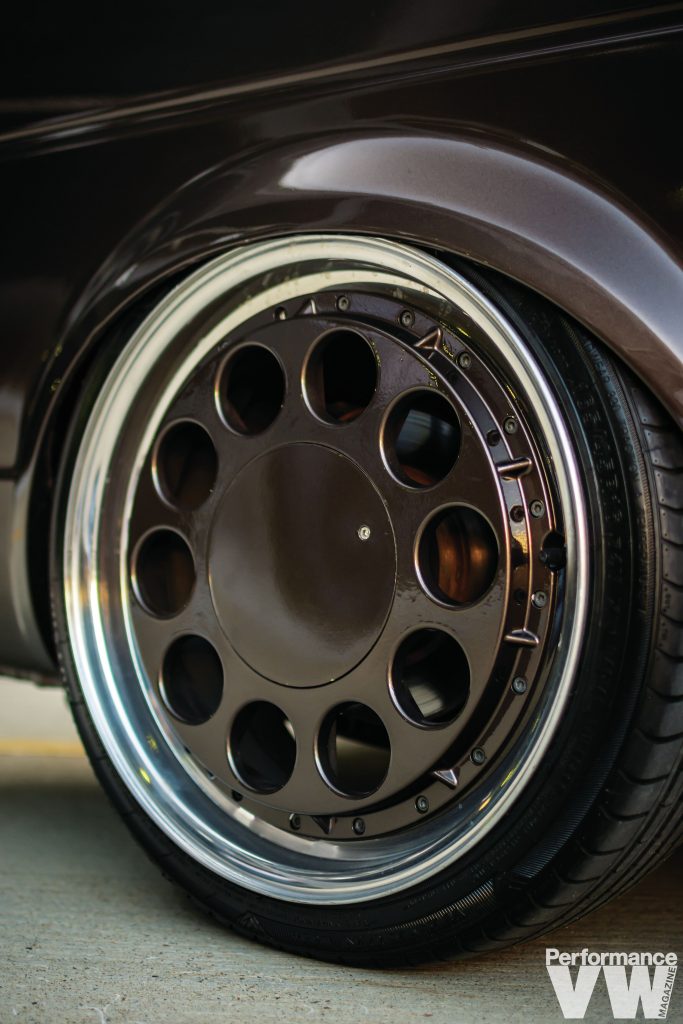 The wheels are colour-matched Japanese 16” Autostrada Mk8 3-piece rollers from the late 80s. Again, it’s hidden Airlift air suspension with 3P management provides the lows. The tank and compressor are tucked under the bed. He figures since it’s not hardline or anything fancy, he may as well keep it out of sight. And while they should be mostly water-proof, he doesn’t drive them in the rain so it shouldn’t matter. A similar set of small bumpers lack the stainless trim here. The icing on the exterior cake is the VW LooseNuts rear safari window, adding that extra air flow to a cabin that lacks the comfort of air conditioning.