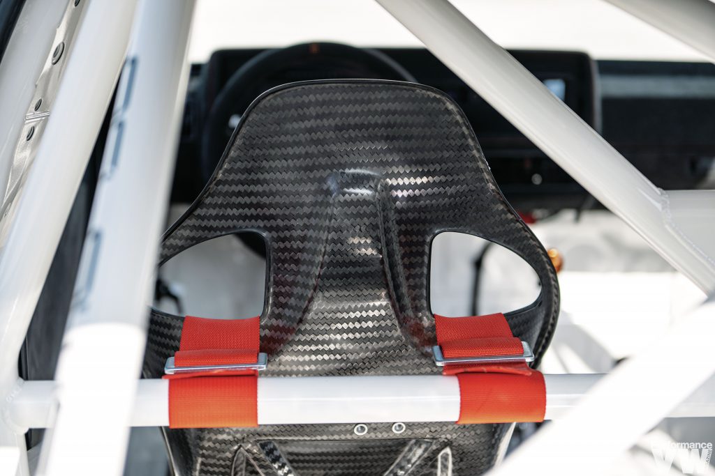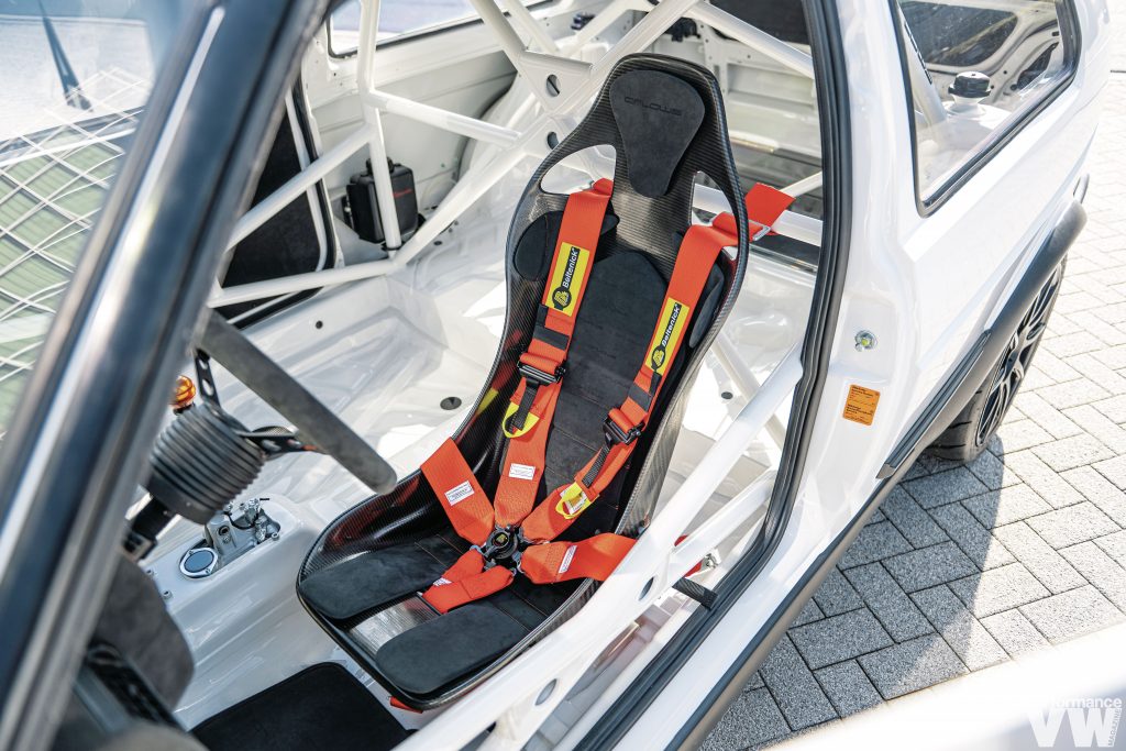This wasn’t a straight restoration. Elbow deep in interior work, Marius went the extra step of cutting out the spare wheel well and roof, replacing both with carbon fibre panels. They’re from Baltic Carbon (the same place that did Philip’s RS4) and paired with a set of matching wings with a 3cm flare. Not that you’d spot those easily, as they’re body coloured. The home-made Macrolon windows are also only noticeable to the touch, while the Liteglas lightweight windscreen is one of those if-you-know-you-know jobs and edges the Golf under 900kg.