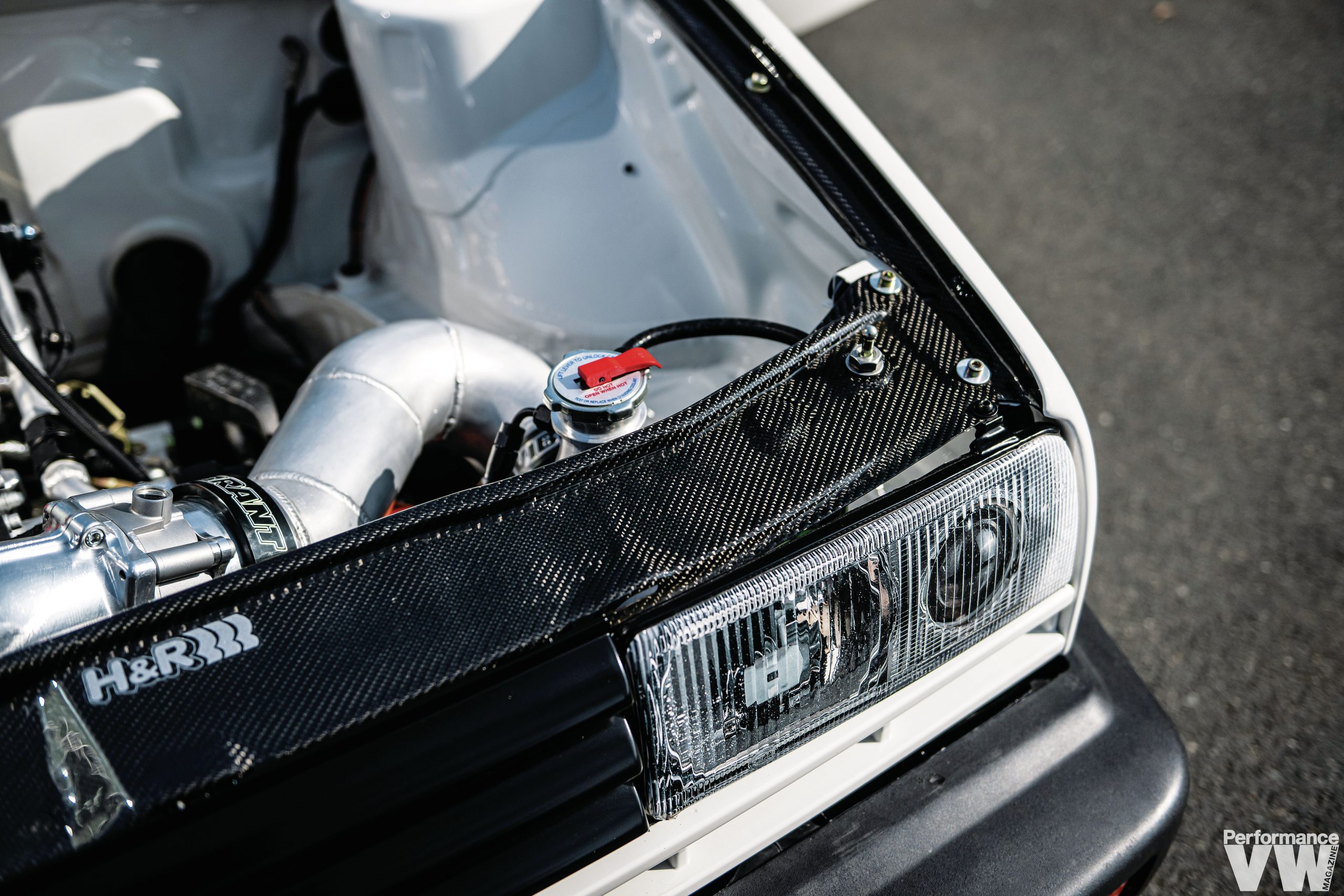 The Golf’s second overhaul was a big one. Marius found the engine on eBay and took on the conversion himself, almost quadrupling the factory power output in the process, and upgraded to G60 brakes with the wider arch trims and Rallye headlights while it was in pieces. The capacity increase had begun a chain reaction. One that led to the Golf getting forced induction and Mk3-spec 5×100 wheel hubs in 2014, followed by a decade of refinements taking that powertrain to where it is now.