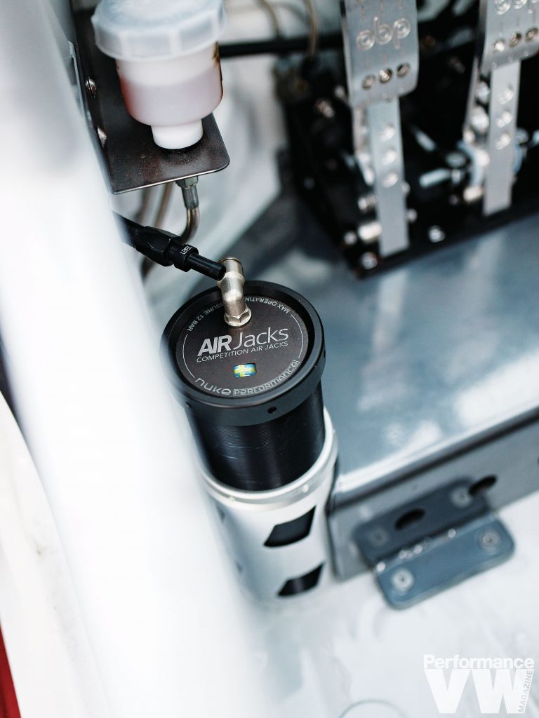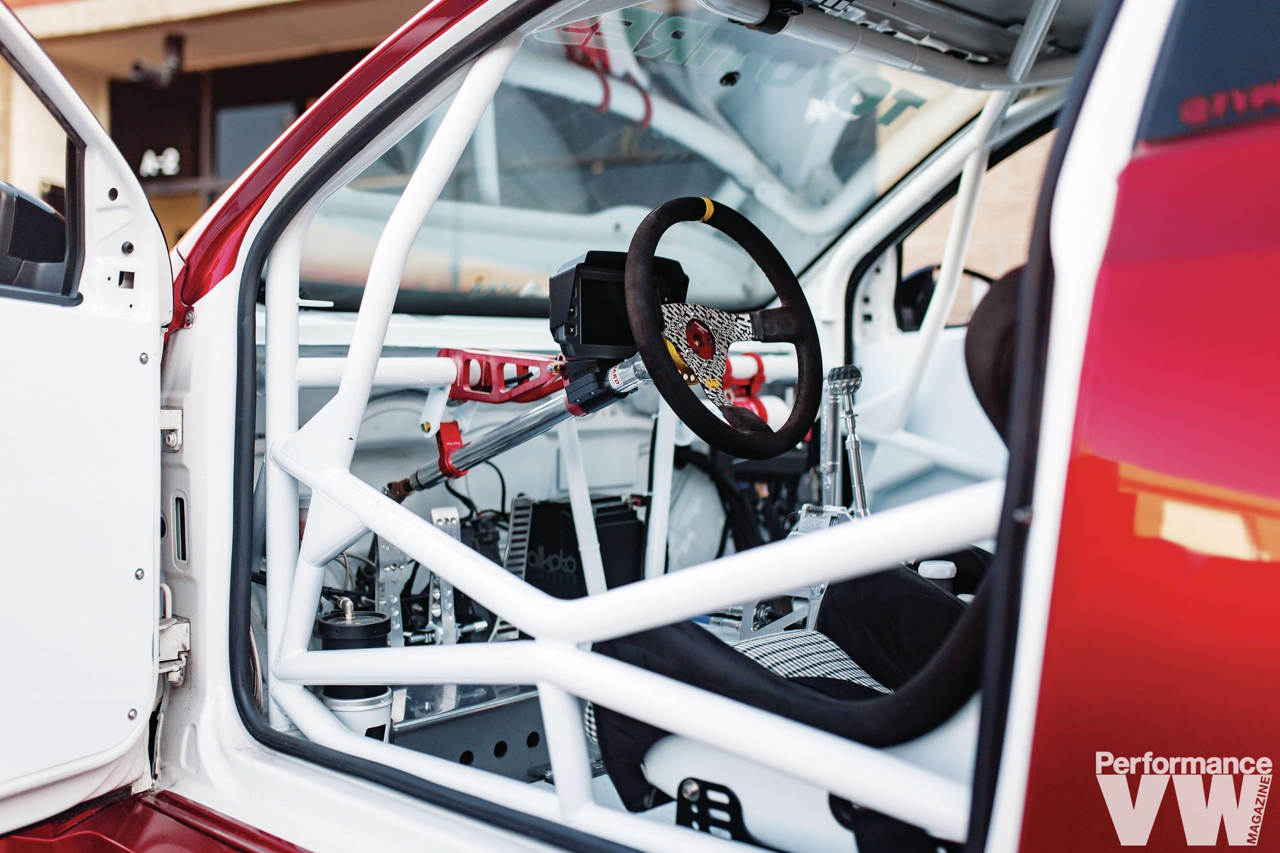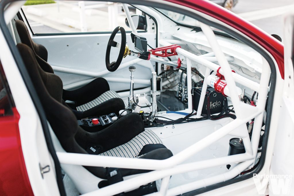 12×18” (square) Rotiform KPR three-piece wheels, Toyo R888R Tires, 315/30/18 tyres. BC Racing coilovers, SuperPro front LCAs, poly bushings and front sway bar, 034Motorsport dogbone, dogbone insert, rear trailing arms, rear camber arms and rear sway bar. Brembo 17Z six-pot (front) and four-pot (rear) brakes with dual rear caliper setup using a Golf R rear caliper. Completely gutted chassis with lots of areas shaved, any unused tabs, brackets, studs, etc all removed and shaved. Chassis resprayed in factory Candy White, full FIA/NASA-spec cage structure made by Cage Kits and TIG Welded by Blood Motorsport USA, custom centre console/tunnel area to mount shifter 3″ further back, and hydro handbrake, custom Seat bracket tubes off the cage structure (sits roughly 3″ further back and 3″ lower from OEM positions), custom front crash bar by Blood Motorsport USA 14616_39eaba-5e> |